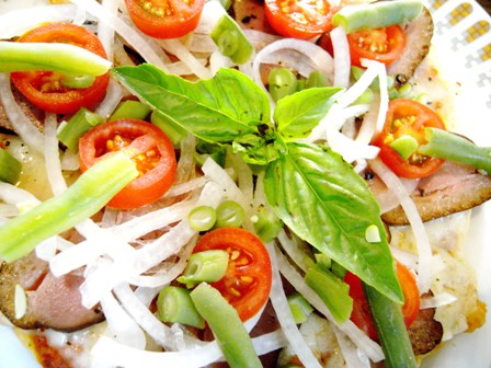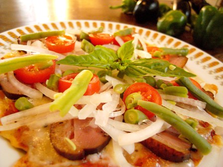 ・上の写真のカモのスモークとえんどう、ミニトマト、しゃきしゃきたまねぎのピザ(場合により一部変更あり)
