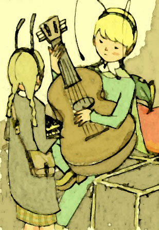 ギターと歌のおかげで あかるい心もちで おしごとができたアリたちは
